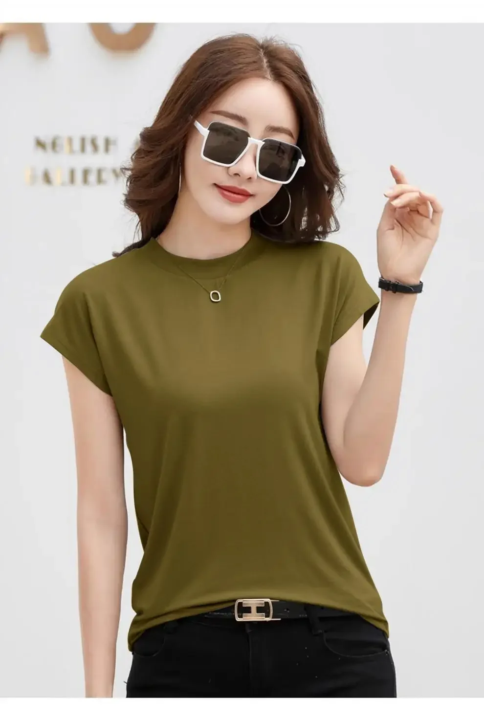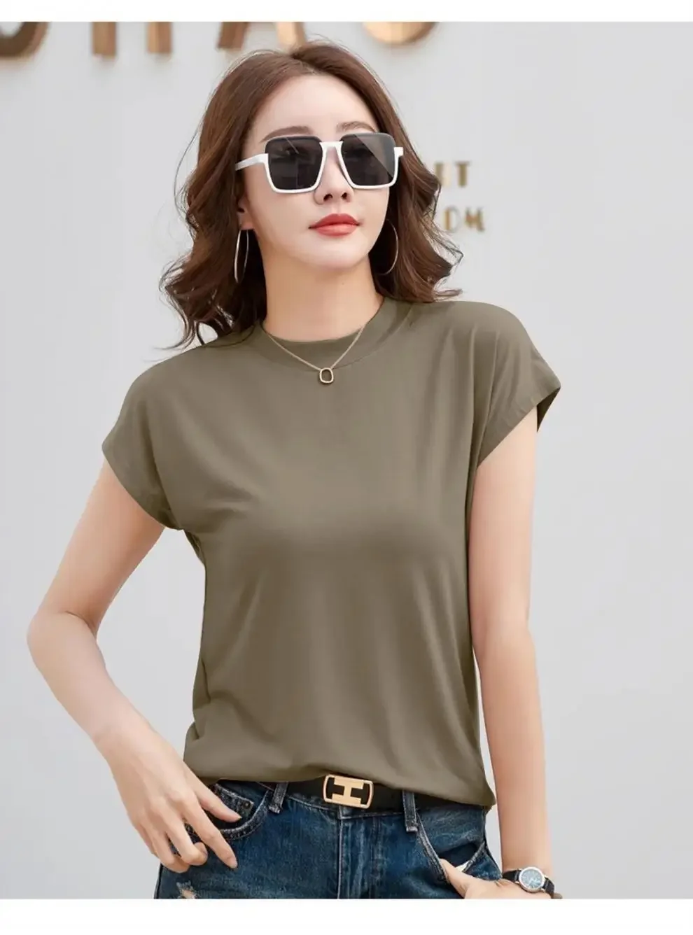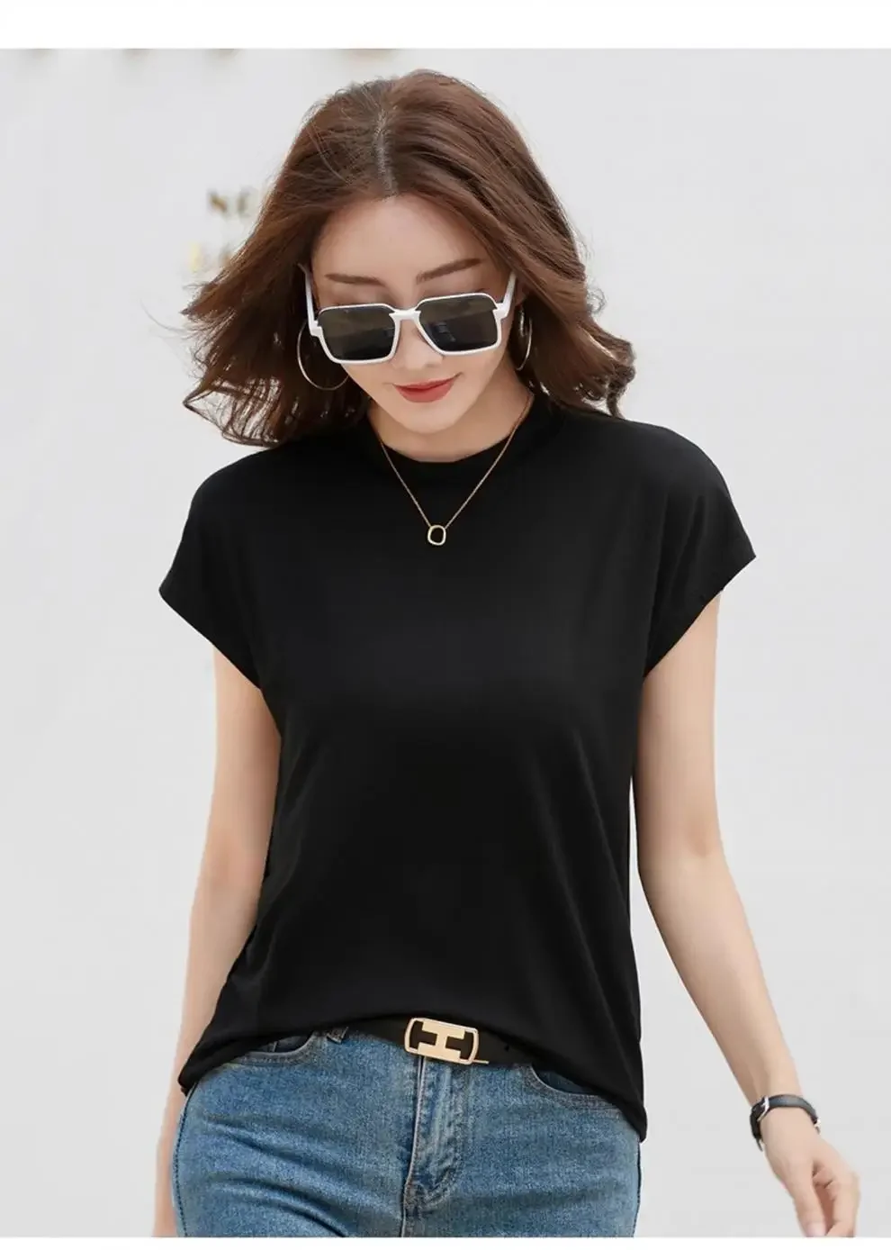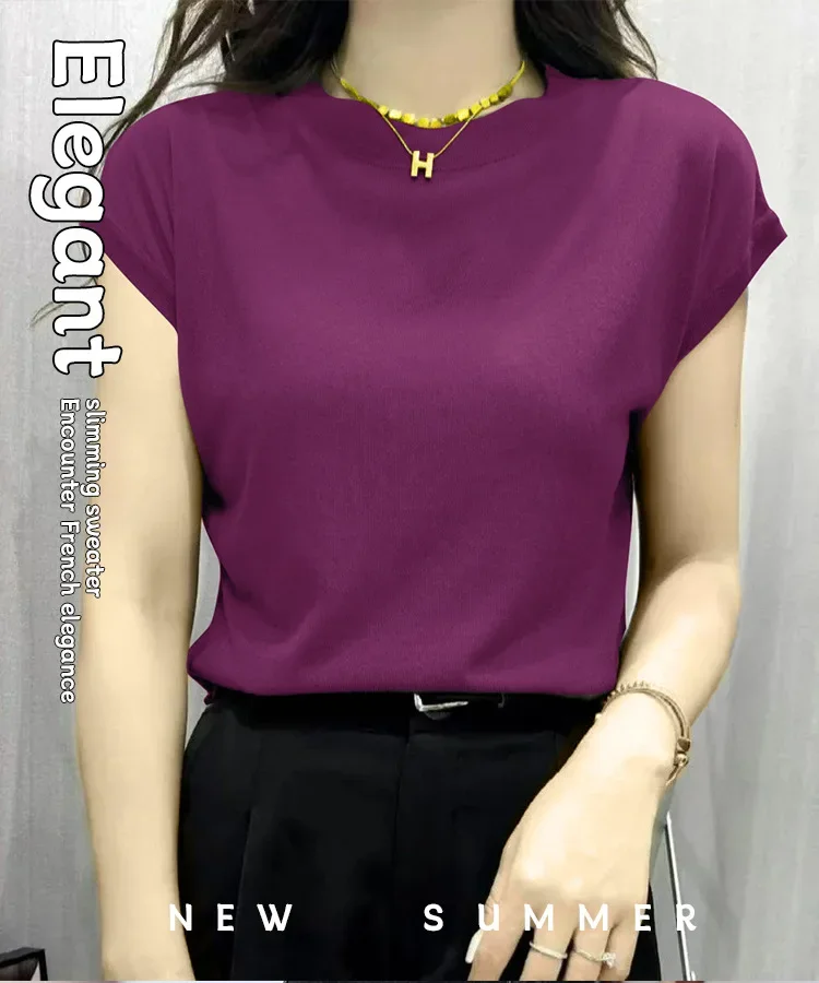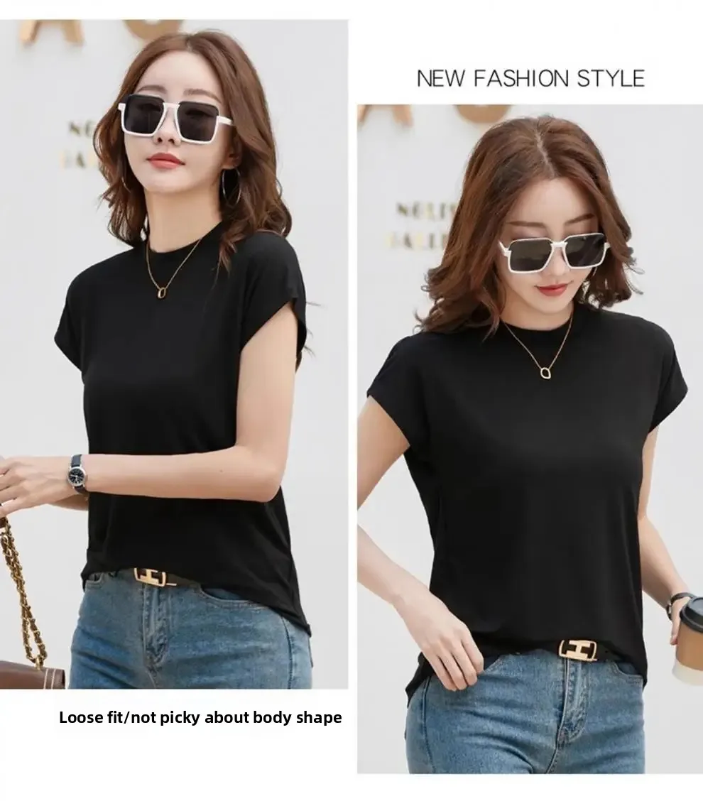 Summer Short Sleeve T-Shirt Women's Loose round Neck Slimming Breathable Top Versatile Shoulder Fit Small Fly Sleeve Design